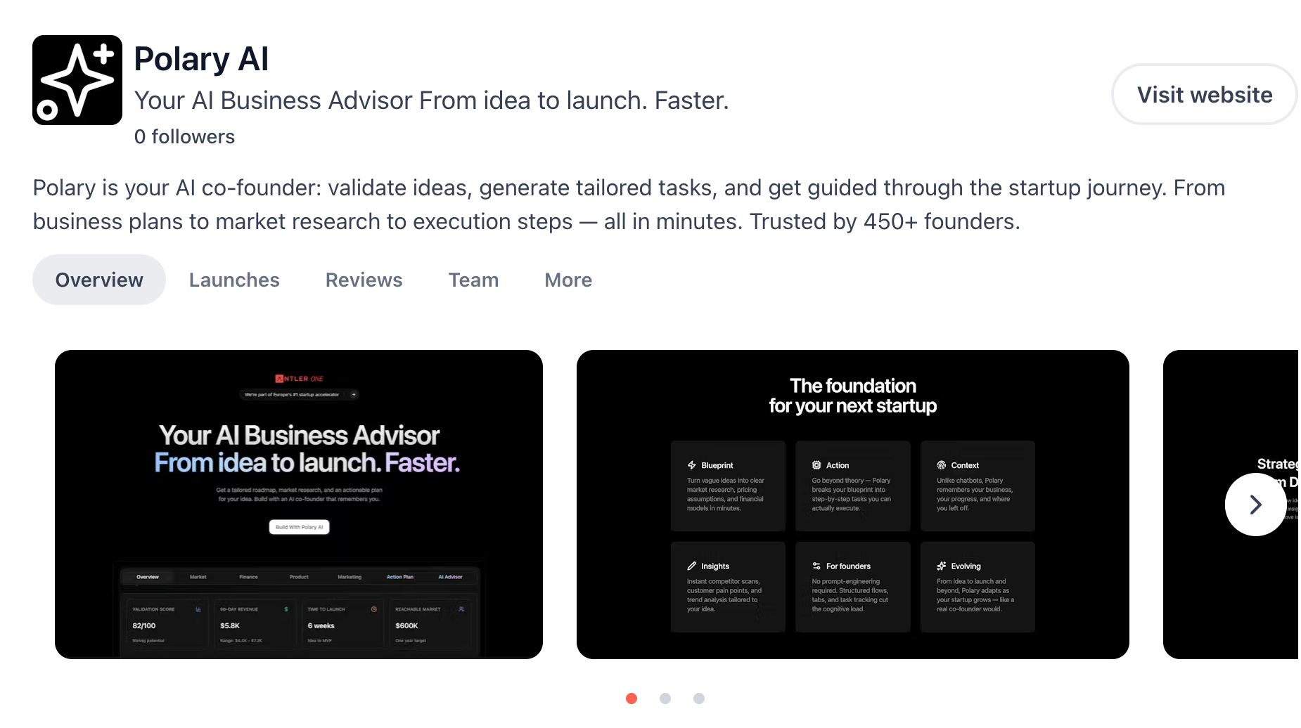 Polary is my AI co-founder. It doesn’t just “validate ideas”—it keeps context, generates AI tasks tailored to your project, and guides you through execution: business plans, market research, growth strategy, next steps. Minutes, not weeks. Hundreds of founders have already used it; now I’m putting it in front of the Product Hunt crowd to see what breaks (and fix it).